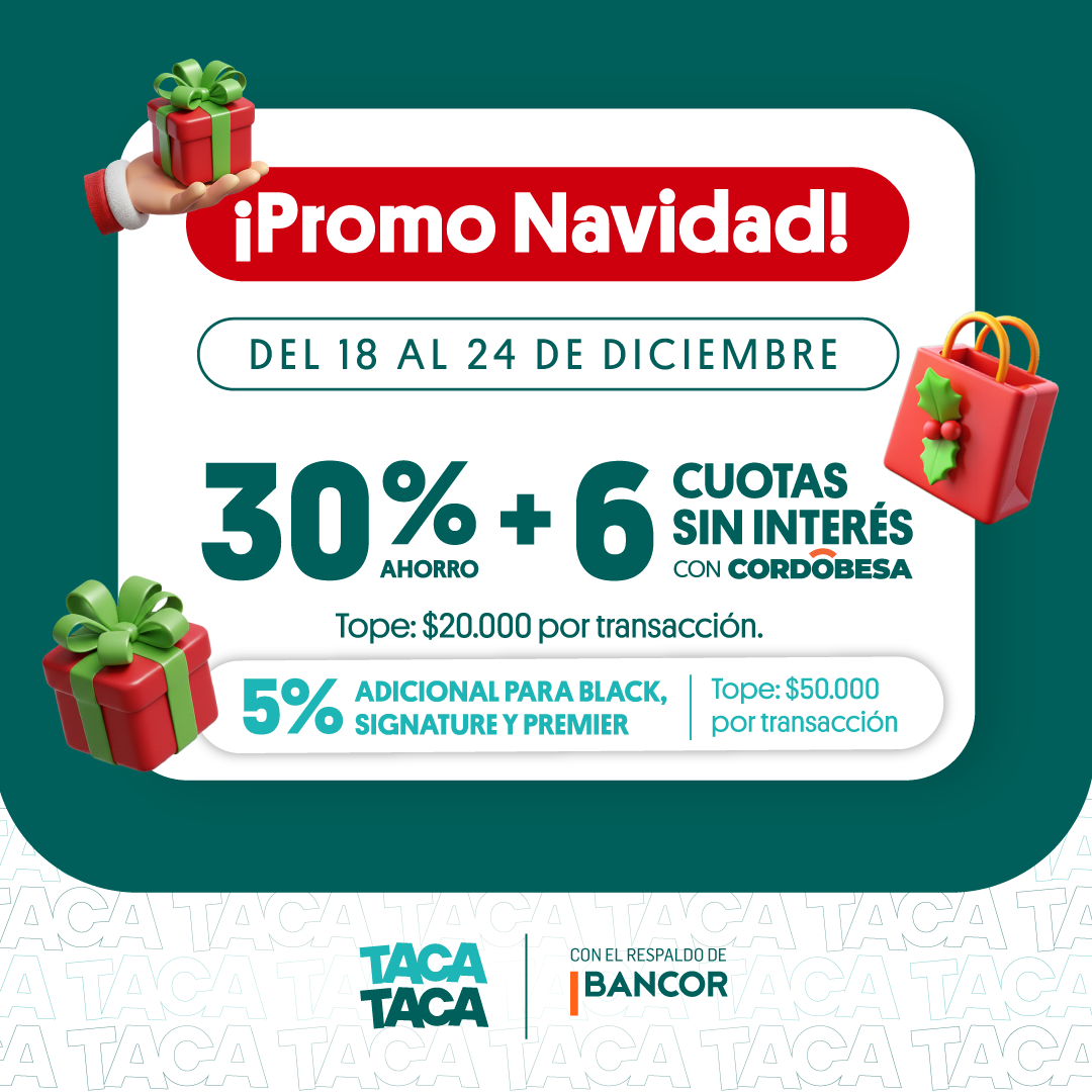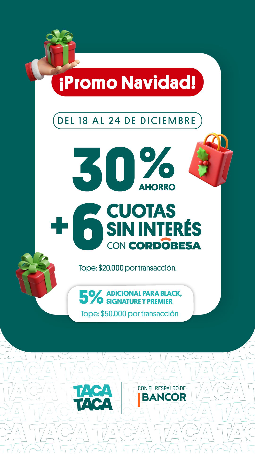 Podrán acceder a esta promoción los comercios registrados en Taca Taca bajo los rubros: calzado, librería, artículos de librería, perfumerías, ropa y accesorios, venta de indumentaria y artículos deportivos, marroquinerías-cueros-pieles, óptica y juguetería que se hayan adherido previamente a la promoción (en adelante los “comercios adheridos”). Los comercios adheridos podrán ofrecer a sus clientes 30% de ahorro + 6 cuotas sin interés los del 18 al 24 de diciembre de 2025, en compras abonadas con tarjetas de crédito de la marca Cordobesa MasterCard o Visa, a través del lector MiniPOS, SmartPOS, QR o link de pago de Taca Taca. El ahorro tiene un tope de $20.000 por transacción. Adicionalmente, los clientes que abonen con tarjetas Cordobesa premium (Black, Signature o Premier) accederán a un 5% extra de ahorro, con un tope de $50.000 por compra. El comercio asumirá el 60% del ahorro y Taca Taca el 40% restante en ambos casos.Comisiones aplicables de acuerdo con el plazo de acreditación configurado en la App: en el acto 6,19% + IVA, en 2 días hábiles 5,29% + IVA, en 7 días hábiles 4,29% + IVA, en 15 días hábiles 2,99% + IVA, en 21 días hábiles 2,49% + IVA, en 30 días hábiles 1,39%; en 45 días hábiles 0,00% + IVA. Válido para la provincia de Córdoba. Sujeto a disponibilidad y activación del servicio.